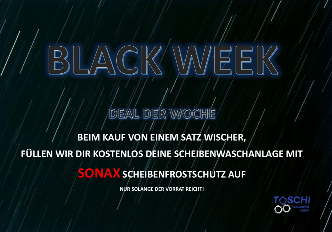 Unsere Blackweek Aktion gilt aus organisatorischen Gründen nur in unserem Hauptsitz in Fraulautern. Wenn ihr in Dillingen oder Überherrn Scheibenwischer kauft, könnt ihr mit eurem Kaufbeleg in Fraulautern vorbei kommen und bekommt kostenlos eure Scheibenwaschanlage mit SONAX Scheibenfrostschutz aufgefüllt.